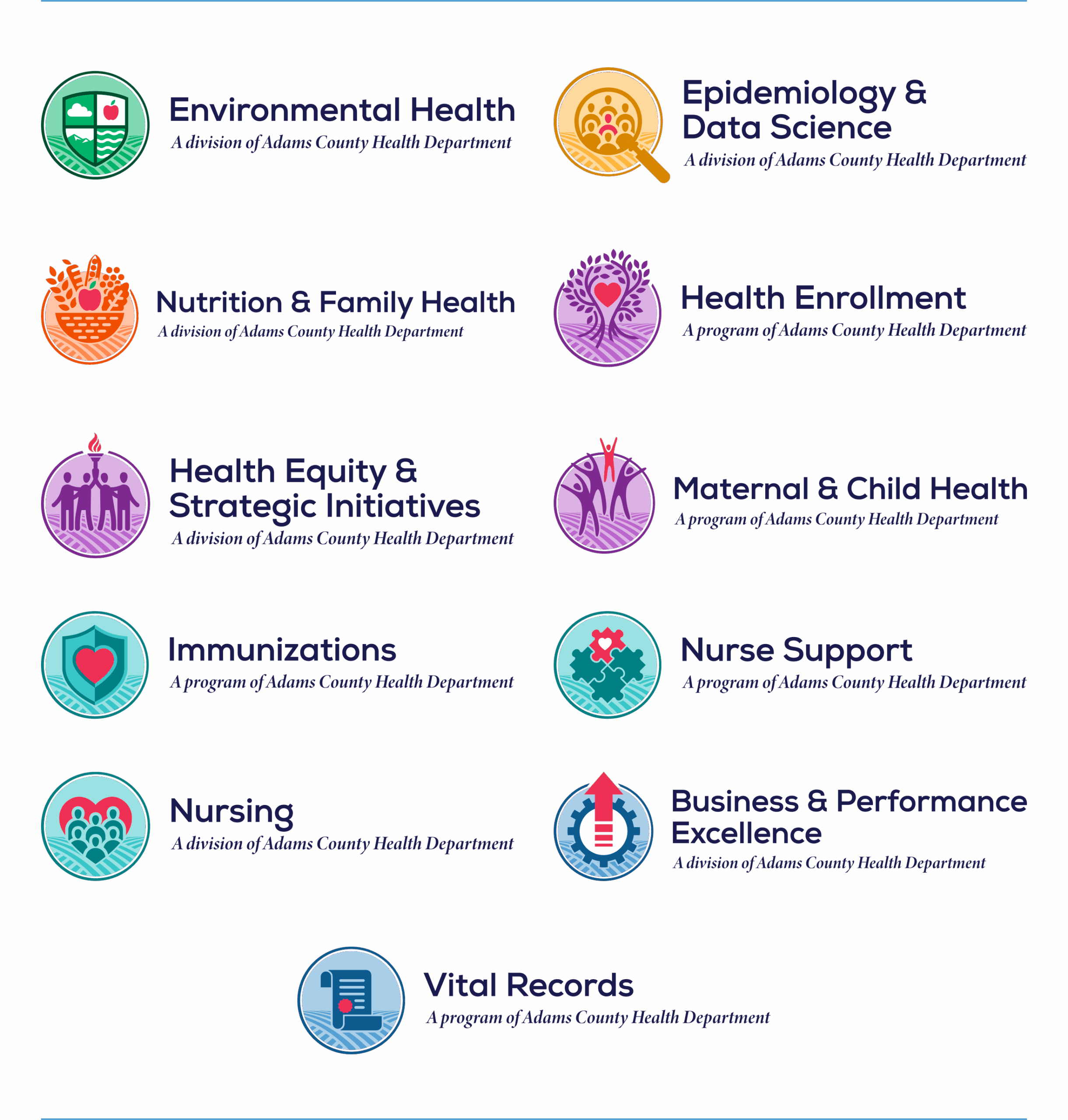 Rebranding the Adams County Health Department was one of the first major projects of our continuing partnership with Adams County. The Health Department needed a new brand and website to raise the recognition, awareness, and accessibility of its services. Because of the department’s expansive size and reach, the branding process also required a full brand system for all its many divisions and programs.